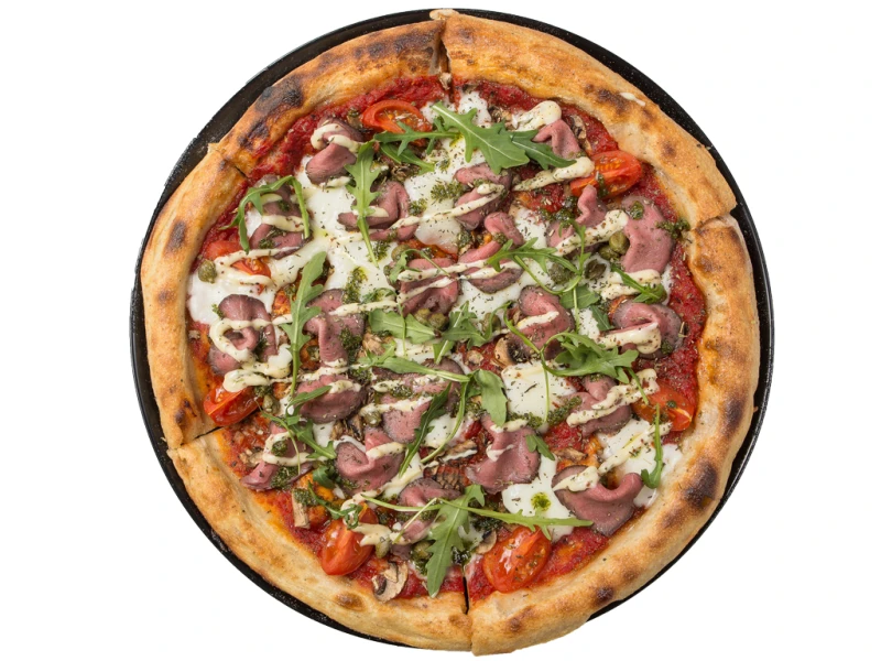 Ростбиф из говядины, шампиньоны, сыр моцарелла, каперсы, томатный соус, томаты, руккола, соус айоли, соус песто