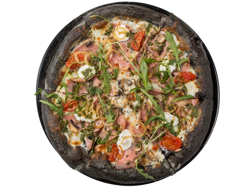 Ветчина(х2), шампиньоны, сливочный соус, сыр фета, сыр моцарелла, руккола, томаты, соус песто
